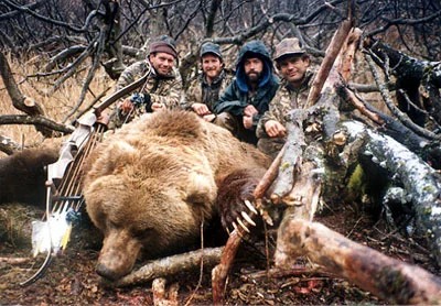 From left to right: Paul Schafer, Jeff Boothe, Brad Adams and Bart Schlayer. Kodiak bear taken by Bart Schlayer in the fall of 1992. One of Paul's last big hunts.