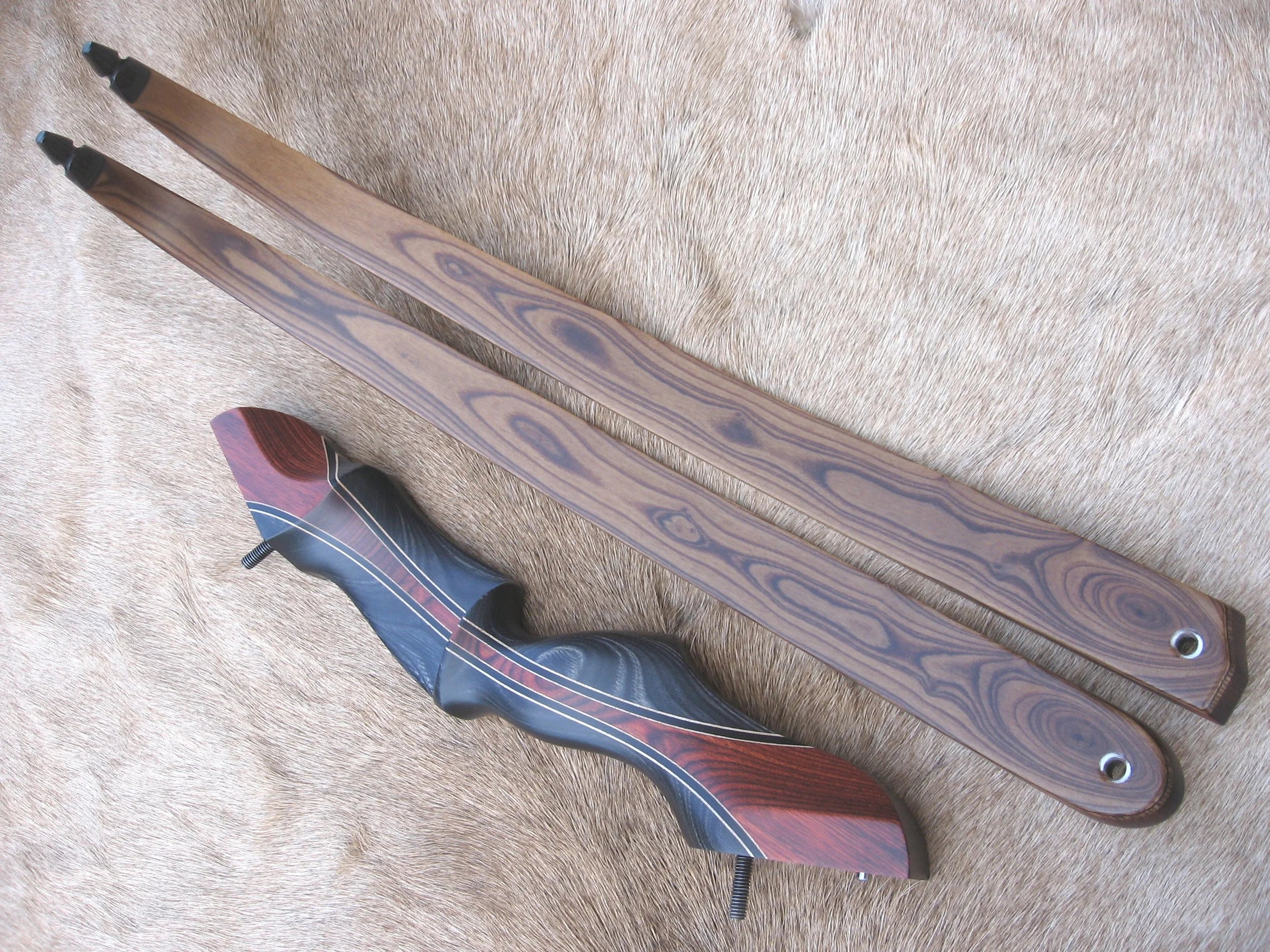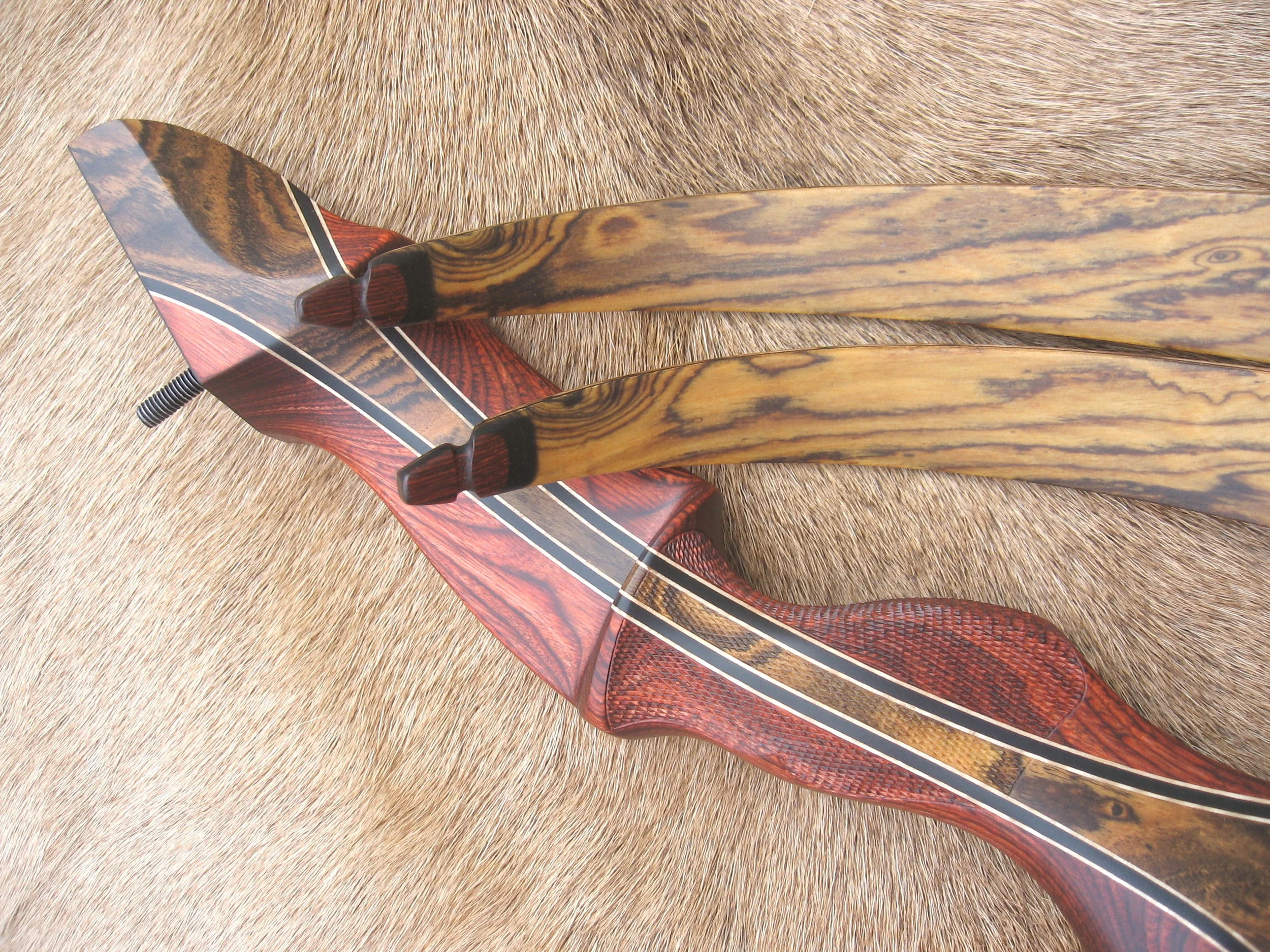 The standard riser wood is Dymondwood offered in a walnut, rosewood, or charcoal stain. Dymondwood is a laminated birch that is impregnated with dyed resins providing an extremely durable and heavier physical weight bow. Additional riser options would include domestic/exotic hardwoods. Exotics have proven to be very durable under all conditions and add nice character to a bow. Each Silvertip comes standard with a straight laminated accent stripe in the riser for strength as is built to accommodate Fast Flight. We also offer a wave or flare configuration in the riser as additional options. Silvertips come with a standard matte finish unless requested otherwise.